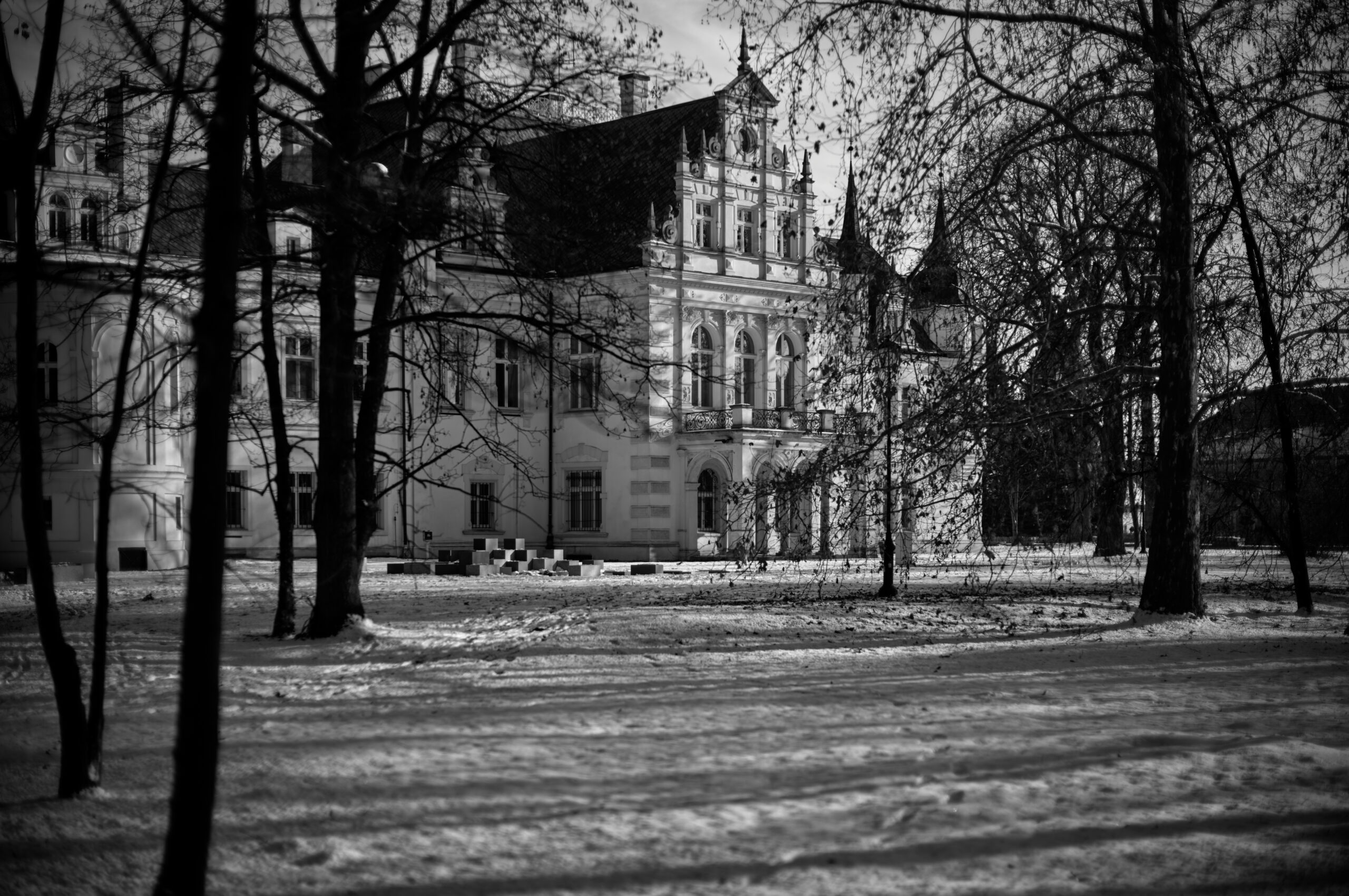 To chyba jedno z najbardziej fotogenicznych miejsc w mieście. Park w Jelczu-Laskowicach po rewitalizacji prezentuje się godnie nawet zimą i stanowi piękne tło dla pałacu. Wczoraj panowała tam kapitalna gra świateł — drzewa rzucały długie, wyraźne cienie, a jasna fasada pałacu mieniła się subtelnymi odcieniami. Zdjęcia robiłem w czerni i bieli, co pozwoliło jeszcze lepiej uchwycić nastrój tego miejsca.